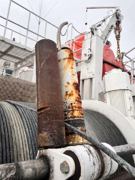 CTD 絞機的垂直導纜滾輪(Roller for level wind-vertical)損壞,進行檢修。